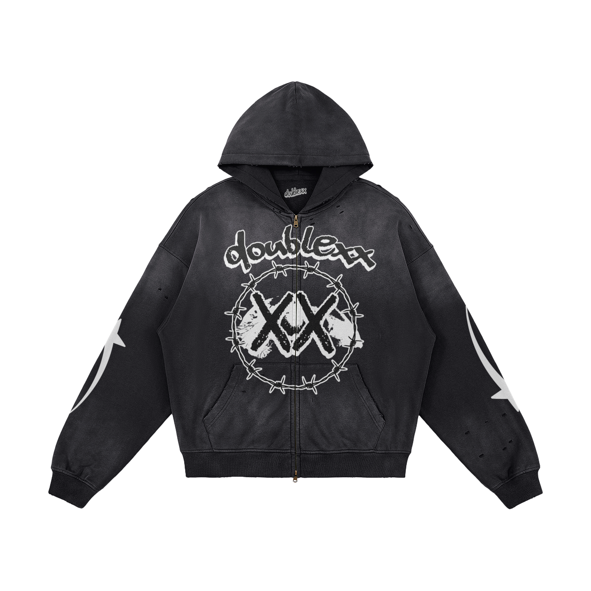 Crafted in 100% cotton, this unisex sun-faded distressed full-zip hoodie channels a vintage streetwear vibe. The sprayed fade wash and subtle worn-in details create a grunge-inspired look, perfect for oversized layering, casual outfits, or statement street style that blends comfort with a bold, lived-in edge.